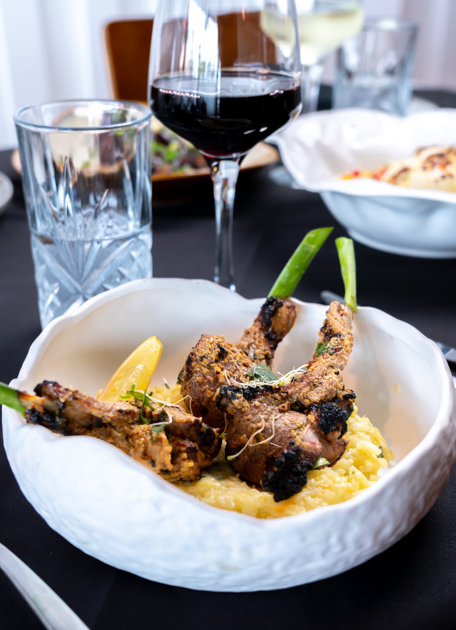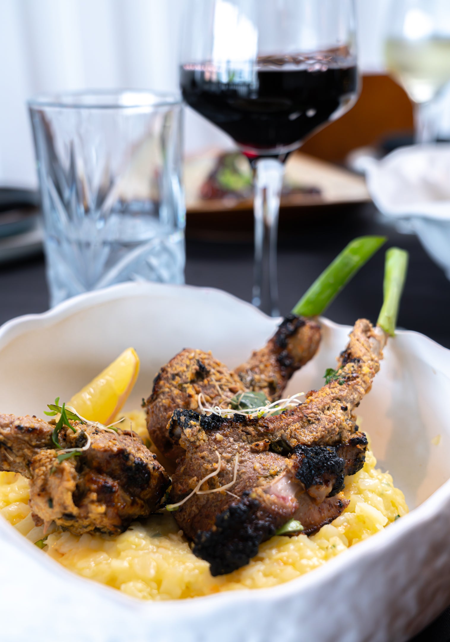 Charred Baby Lamb Cutlets, Hung Yogurt, Marinade Hand Beaten Ground Spices, Garlic Potato Mash.
