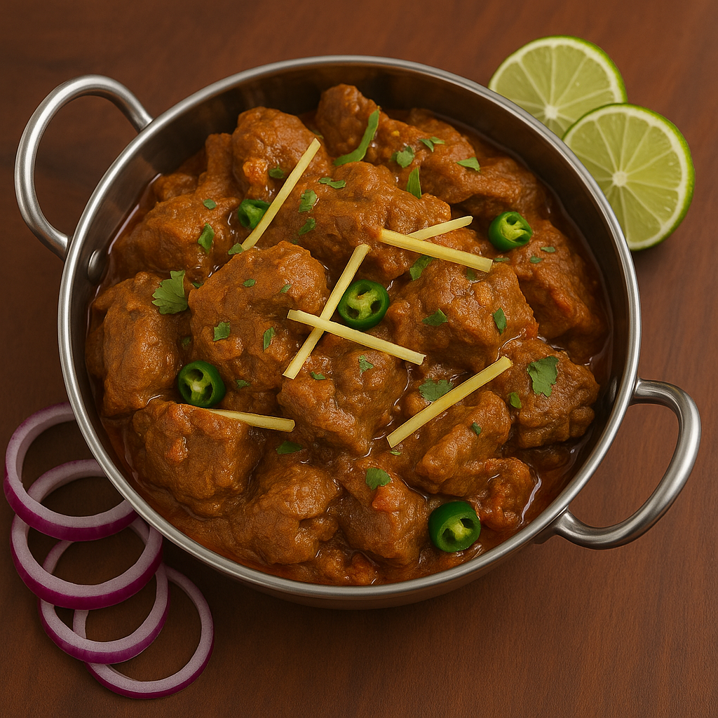 Tender lamb pieces tossed with capsicum, onion, and tomato in a thick, spiced gravy for a bold and aromatic North Indian classic.